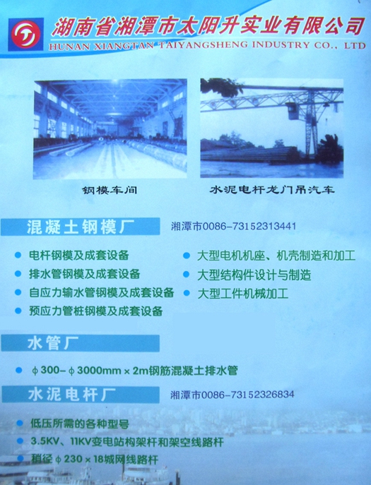 1、鋼模制造廠: ①電桿鋼模及成套設(shè)備和技術(shù)服務(wù); ②給排水管鋼模及成套設(shè)備和技術(shù)服務(wù); ③預(yù)應(yīng)力管樁鋼模及成套設(shè)備和技術(shù)服務(wù); ④預(yù)應(yīng)力高強(qiáng)絲生產(chǎn)成套設(shè)備和技術(shù)服務(wù); ⑤大型結(jié)構(gòu)件設(shè)計(jì)與制造。 2、預(yù)應(yīng)力水泥電桿廠: 高、低壓線路桿和構(gòu)架桿,錐型;等徑 、系列配件。 3、排水管廠: 生產(chǎn)Φ200~Φ400×2m平口、企口、承插、頂管等系列產(chǎn)品,為鐵路、公路、排污、引水、市政、房建等工程配套使用。